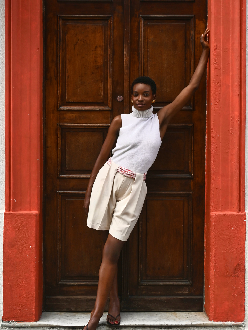 A bermuda ENVOLTO traz uma modelagem de alfaiataria com construção pensada nos detalhes. Seu diferencial está nas pregas frontais com passante integrado, que estruturam a peça e criam movimento na silhueta.